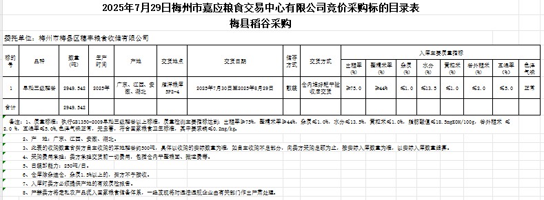 受客戶委托,梅州市嘉應糧食交易中心有限公司定于2025年7月29日(星期二)舉辦糧食競價交易會。梅州市梅縣區(qū)穗豐糧食收儲有限公司擬采購2025年產(chǎn)早秈稻谷2949.542噸。