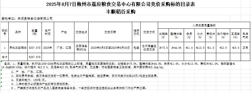 受客戶(hù)委托,梅州市嘉應(yīng)糧食交易中心有限公司定于2025年8月7日(星期四)舉辦糧食競(jìng)價(jià)交易會(huì)。豐順縣糧食收儲(chǔ)有限公司擬采購(gòu)2025年產(chǎn)早秈稻谷5207.878噸。