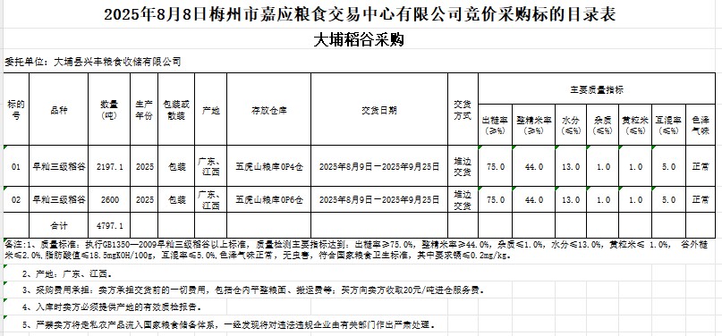 2025年8月8日大埔縣興豐糧食收儲(chǔ)有限公司稻谷采購