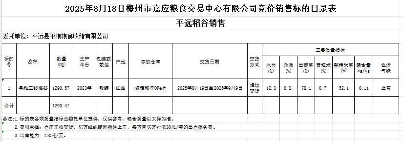 受客戶委托,梅州市嘉應(yīng)糧食交易中心有限公司定于2025年8月18日(星期一)舉辦糧食競(jìng)價(jià)交易會(huì)。平遠(yuǎn)縣平糧糧食收儲(chǔ)有限公司擬銷售2023年產(chǎn)早秈稻谷1290.57噸。