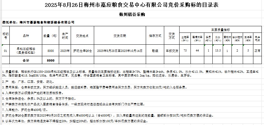 受客戶委托,梅州市嘉應(yīng)糧食交易中心有限公司定于2025年8月26日(星期二)舉辦糧食競(jìng)價(jià)交易會(huì)。梅州市嘉泰糧食和物資儲(chǔ)備有限公司擬采購2025年產(chǎn)早秈稻谷8000噸。
