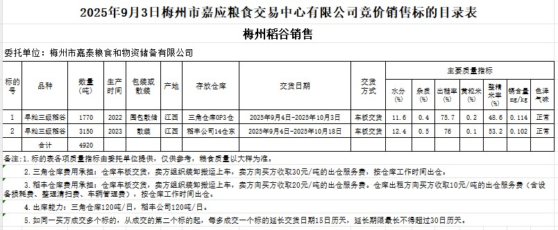 受客戶委托,梅州市嘉應(yīng)糧食交易中心有限公司定于2025年9月3日(星期三)舉辦糧食競(jìng)價(jià)交易會(huì)。梅州市嘉泰糧食和物資儲(chǔ)備有限公司擬銷售2022年、2023年產(chǎn)早秈稻谷4920噸。