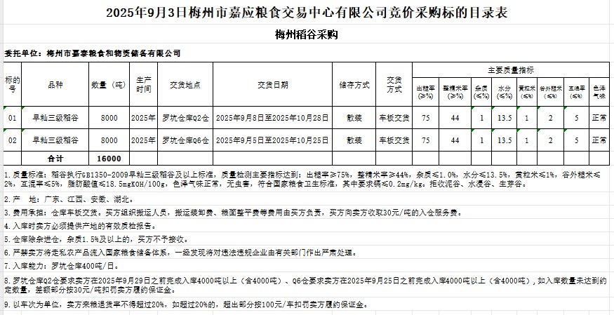 受客戶委托,梅州市嘉應糧食交易中心有限公司定于2025年9月3日(星期三)舉辦糧食競價交易會。梅州市嘉泰糧食和物資儲備有限公司擬采購2025年產(chǎn)早秈稻谷16000噸。