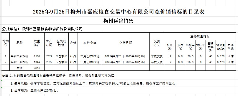 受客戶委托,梅州市嘉應(yīng)糧食交易中心有限公司定于2025年9月25日(星期四)舉辦糧食競價(jià)交易會(huì)。梅州市嘉泰糧食和物資儲(chǔ)備有限公司擬銷售2022年產(chǎn)早秈稻谷2844噸。