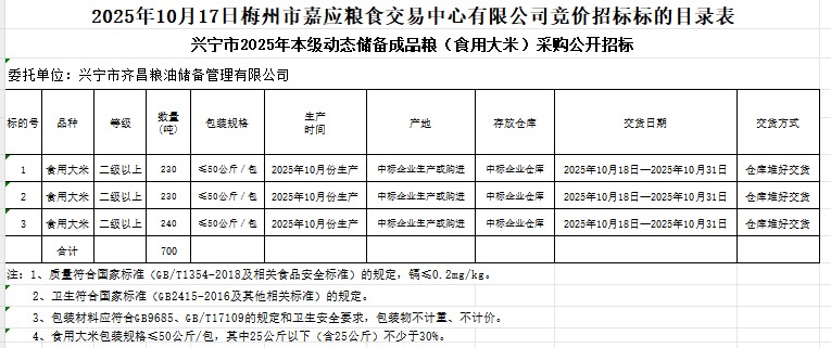 興寧市2025年本級動態(tài)儲備成品糧(食用大米)采購及代儲包干輪換費用公開招標公告
