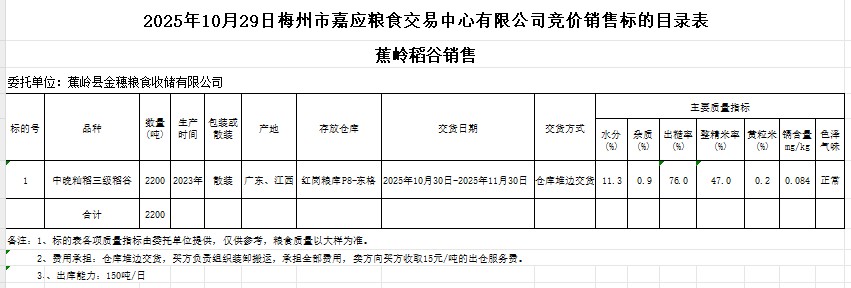 受客戶委托,梅州市嘉應(yīng)糧食交易中心有限公司定于2025年10月29日(星期三)舉辦糧食競(jìng)價(jià)交易會(huì)。蕉嶺縣金穗糧食收儲(chǔ)有限公司擬銷售2023年產(chǎn)中晚秈稻谷2200噸。