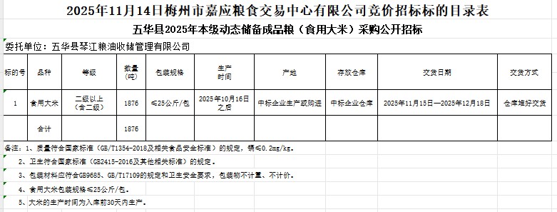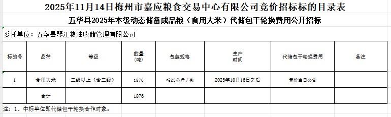 五華縣2025年本級動態(tài)儲備成品糧(食用大米)采購及代儲包干輪換費用公開招標公告