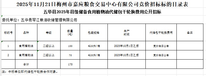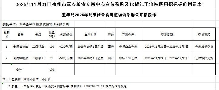 五華縣2025年縣級儲(chǔ)備食用植物油采購及代儲(chǔ)包干輪換費(fèi)用公開招標(biāo)公告