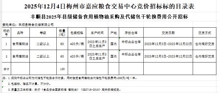 豐順縣2025年縣級儲備食用植物油采購及代儲包干輪換費用公開招標(biāo)公告