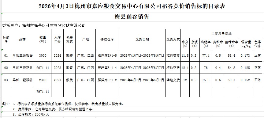 受客戶委托,梅州市嘉應(yīng)糧食交易中心有限公司定于2026年4月3日(星期五)舉辦糧食競價(jià)交易會(huì)。梅州市梅縣區(qū)穗豐糧食收儲(chǔ)有限公司擬銷售2023年產(chǎn)早秈稻谷7971.11噸。