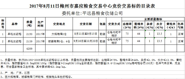 受客戶委托,梅州市嘉應(yīng)糧食交易中心有限公司定于2017年8月11日舉辦糧食競(jìng)價(jià)交易會(huì),平遠(yuǎn)縣糧食收儲(chǔ)公司擬采購(gòu)2017年早秈三級(jí)稻谷共4289噸。