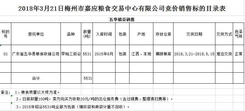 交易時間和地點:2018年3月21日(星期三)上午10時。廣東省梅州市彬芳大道南161號梅州市糧食交易中心3樓。
