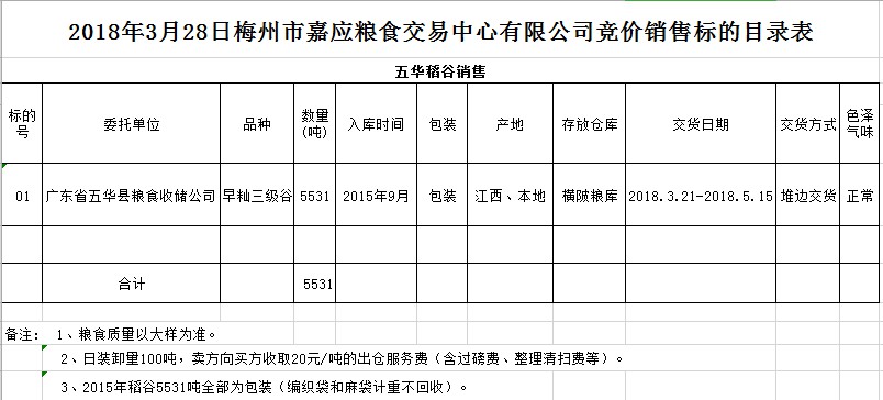受客戶委托,梅州市嘉應(yīng)糧食交易中心有限公司定于2018年3月28日(星期三)舉辦糧食競價(jià)交易會(huì),廣東省五華縣糧食收儲(chǔ)公司擬銷售早秈稻5531噸。