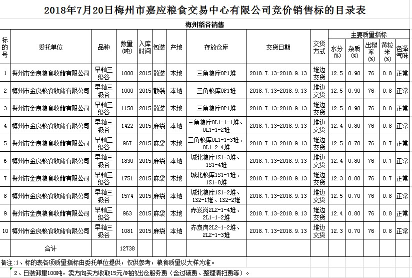 受客戶委托,梅州市嘉應(yīng)糧食交易中心有限公司定于2018年7月20日(星期五)舉辦糧食競(jìng)價(jià)交易會(huì),梅州市金良糧食收儲(chǔ)有限公司擬銷售早秈稻12738噸。