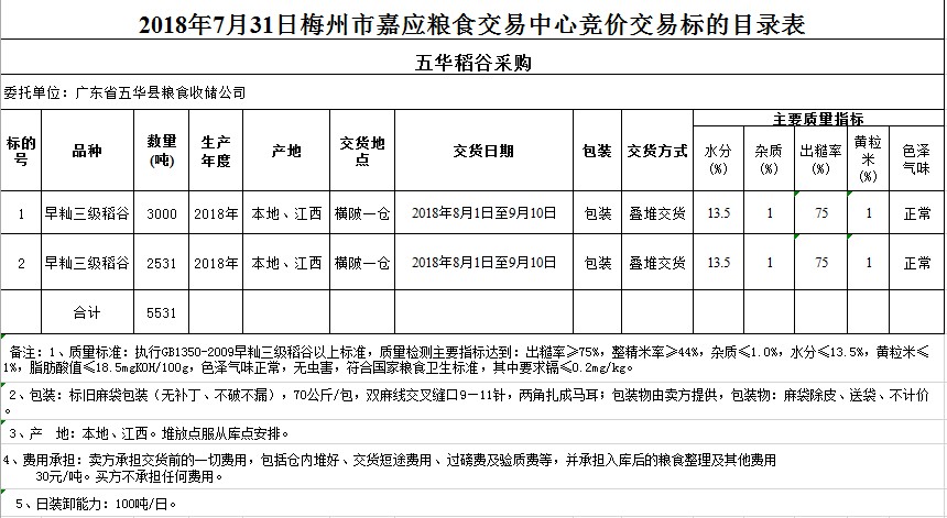 交易時間和地點(diǎn):2018年7月31日(星期二)上午10時。廣東省梅州市彬芳大道南161號梅州市糧食交易中心3樓。