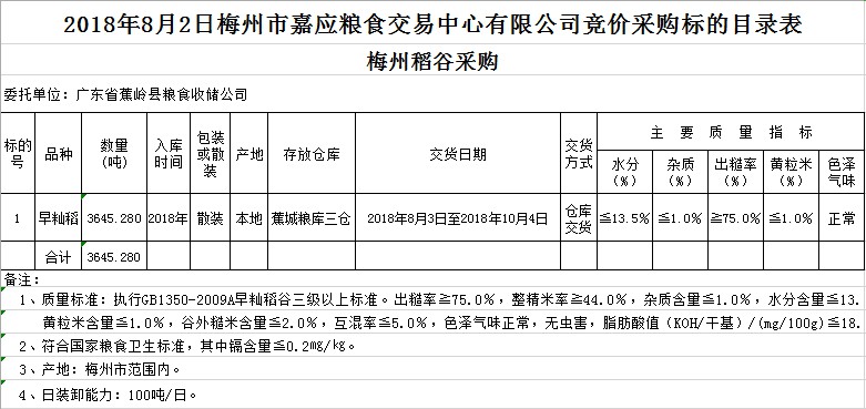 受客戶委托,梅州市嘉應(yīng)糧食交易中心有限公司定于2018年8月2日舉辦糧食競價(jià)交易會(huì),廣東省蕉嶺縣糧食收儲(chǔ)公司擬采購2018年產(chǎn)早秈三級(jí)稻谷3645.28噸。